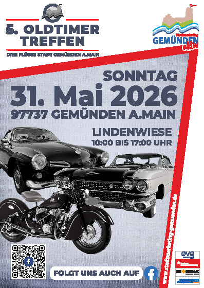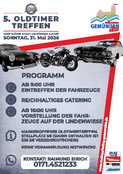Am Sonntag, den 31. Mai erwartet Euch wieder ein Oldtimertreffen der besonderen Art. In außergewöhnlichem Ambiente in der Drei-Flüsse-Stadt Gemünden am Main im schönen Unterfranken ist alles gerichtet für einen wunderschönen Tag der die Herzen aller Oldtimerfreunde höher schlagen lassen wird. Die Ausstellungsfläche auf der Lindenwiese und der angrenzenden Duivenallee verwandelt sich in ein Eldorado für alle Kenner und Fans von Oldtimer-, und Youngtimerfahrzeugen aller Hersteller und Bauarten. Neben PKWs sind natürlich auch Motorräder, Sonder-, und Kleinfahrzeuge herzlich willkommen. Ein reichhaltiges Catering, organisiert von Ortsvereinen unterstützt von weiteren Anbietern, sorgt für die kulinarische Versorgung während der Veranstaltung. Zum Abschluss wird es auf der Lindenwiese eine interessante Parade und Vorstellung der Fahrzeuge geben. Kommt und genießt dieses außergewöhnliche Spektakel am 31. Mai. Beginn 10 Uhr. Es ist keine Voranmeldung erforderlich.